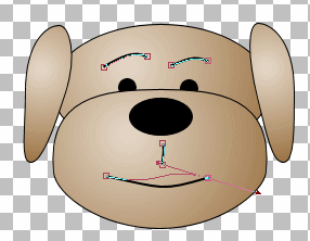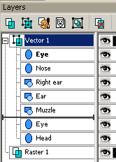 You will notice that the eyes are in front of the muzzle layer. This is easily corrected. In the "Layer" palette drag the eye layers down below the muzzle layer. |